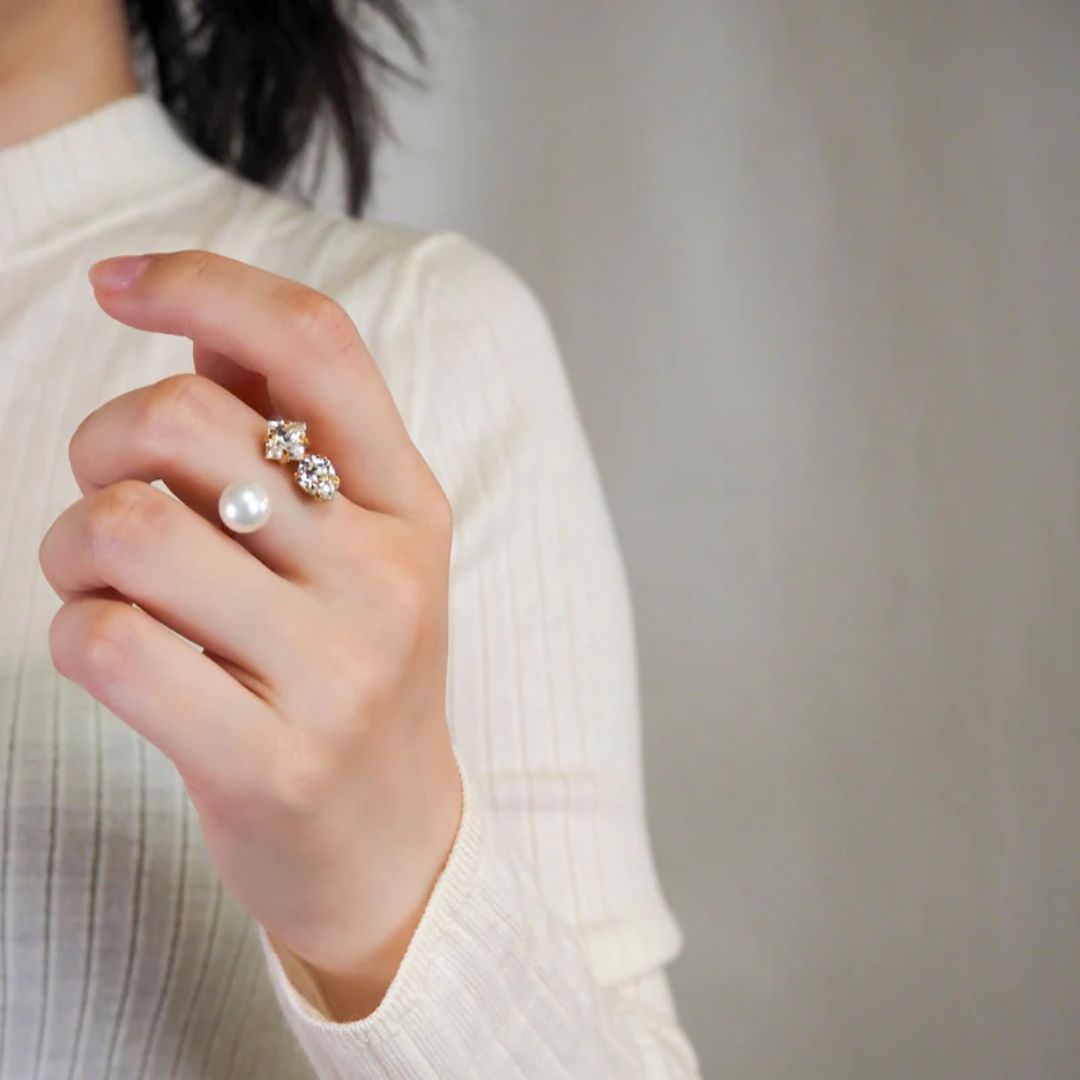クリスタル×10mmのパールの組み合わせが華やかに手元を演出。モードな仕上がりで、シンプル好きだけどインパクトをプラスしたい方におすすめ。